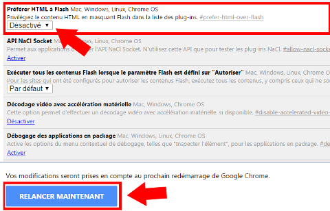 Dans cette longue page de configuration du navigateur, il vous faudra rechercher l’option "Préférer HTML à Flash". Sélectionnez "Désactiver", puis cliquez sur le bouton "Relancer maintenant".