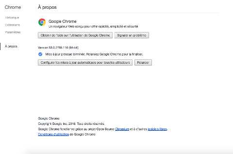 Pour voir à quelle version de Chrome vous êtes, il suffit de cliquer sur le bouton de menu (en haut à droite de Chrome), puis "Aide "et "A propos de Google Chrome".
