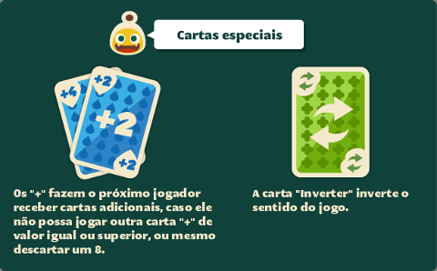 Nota 2: As cartas "+" podem se acumular. Por exemplo, o jogador 1 descarta um "+2", o jogador 2 um "+4", o jogador 3 não pode jogar uma carta igual ou superior ou um 8, então recebe 6 cartas e perde sua vez de jogar.